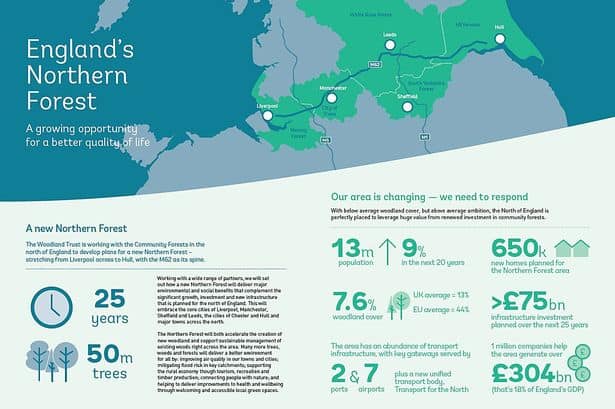 The forest will span 120 miles, connecting Manchester with Liverpool and Lancaster in the west and Sheffield, Leeds and Hull to the east, benefiting 13 million residents and generating £2.5 billion in social, economic and environmental benefits. It would also absorb up to 7.5m tonnes of carbon.