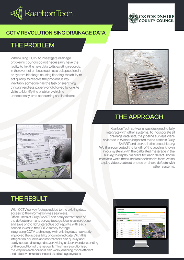 KaarbonTech conducted CCTV surveys and linked new footage, with its existing data, to create a full inventory of its drainage asset, bringing it together in one easy to access platform.