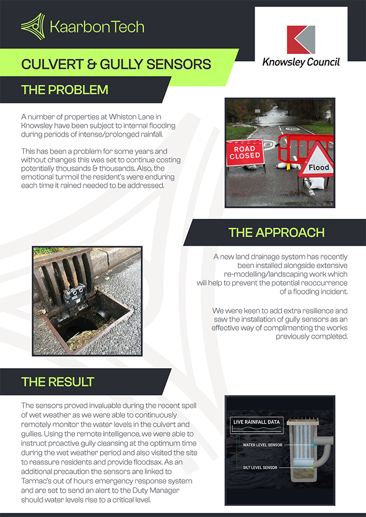 KaarbonTech, in conjunction with Tarmac, supplied and installed 6 Gully Sensors and 2 Culvert Sensors in Knowsley.