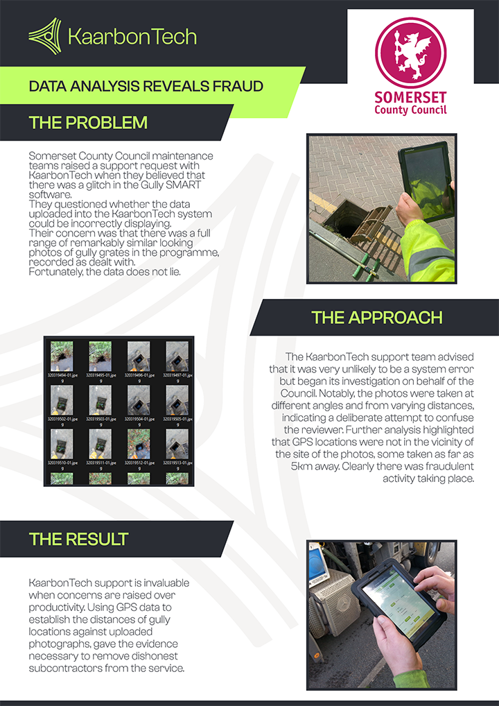 Somerset County Council maintenance teams raised a support request with KaarbonTech when they believed that there was a glitch in the Gully SMART software.