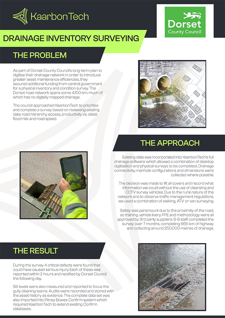 As part of Dorset County Council’s long-term plan to digitise their drainage network in order to introduce greater asset maintenance efficiencies, they secured additional funding from central government for a physical inventory and condition survey. The Dorset road network spans some 4,100 km, much of which has no digitally mapped drainage. The council approached KaarbonTech to prioritise and complete a survey based on reviewing existing data, road hierarchy, access, productivity vs. detail, flood risk and road speed.