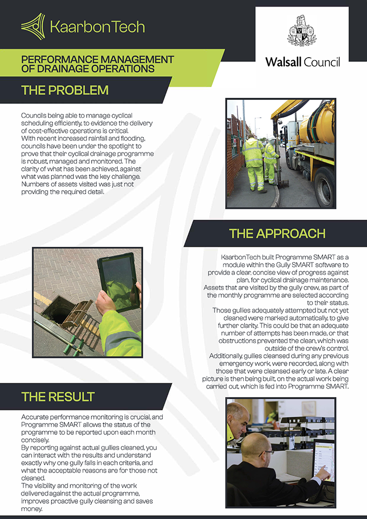KaarbonTech built Programme SMART as a module within the Gully SMART software to provide a clear, concise view of progress against the plan, for cyclical drainage maintenance.Assets that are visited by the gully crew, as part of the monthly programme are selected according to their status i.e.