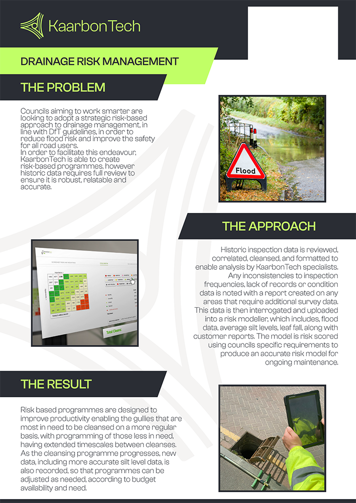 Historic inspection data is reviewed, correlated, cleansed, and formatted to enable analysis by KaarbonTech specialists. Any inconsistencies in inspection frequencies, lack of records or condition data is noted with a report created on any areas that require additional survey data. This data is then interrogated and uploaded into a risk modeller, which includes, flood data, average silt levels, and leaf fall, along with customer reports. The model is risk-scored using the council's specific requirements to produce an accurate risk model for ongoing maintenance.