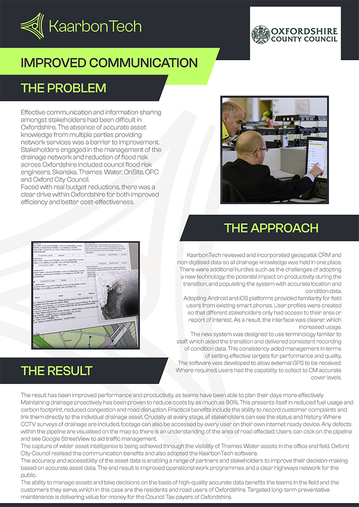 The capture of wider asset intelligence is being achieved through the visibility of Thames Water assets in the office and field. Oxford City Council realised the communication benefits and also adopted the KaarbonTech software.