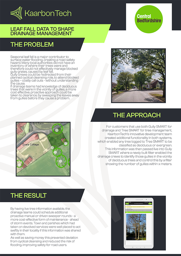 Seasonal leaf fall is a major contributor to surface water flooding, creating a road safety hazard. Many local authorities did not have an inventory of where their trees were and therefore could not effectively manage blocked gully grates, caused by leaf fall.