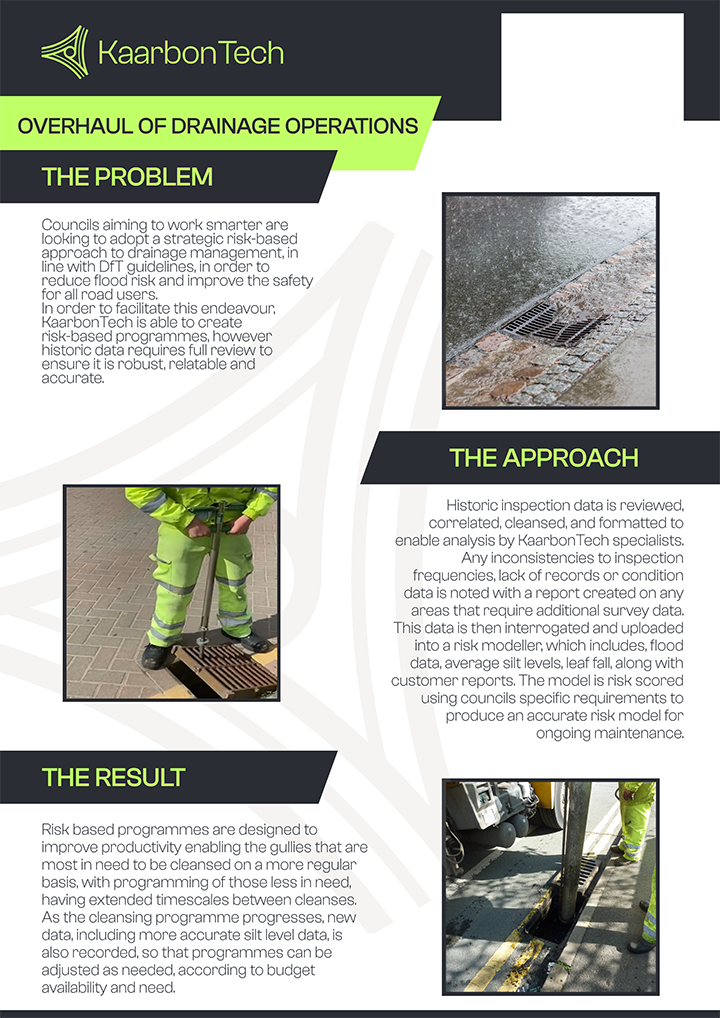 KaarbonTech staff reviewed, researched, analysed, and cleansed the maintenance process and historic drainage datasets - including inspection, complaints, and flood data. All usable data was then input into their tailored Gully SMART system.