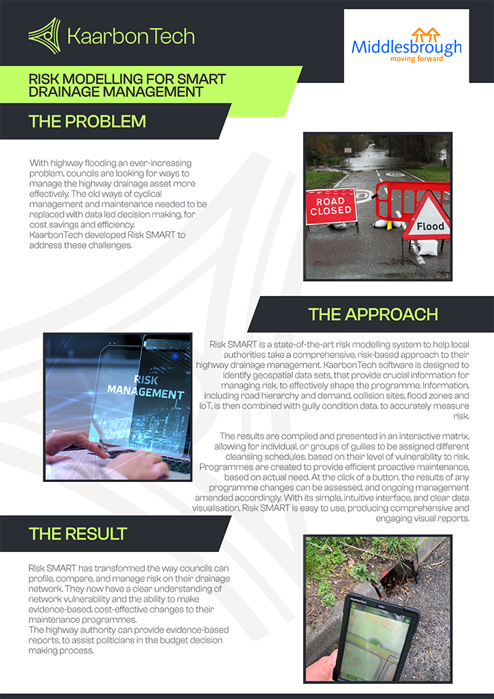 With highway flooding an ever-increasing problem, councils are looking for ways to manage the highway drainage asset more effectively. The old ways of cyclical management and maintenance needed to be replaced with data-led decision making, for cost savings and efficiency. KaarbonTech developed Risk SMART to address these challenges.