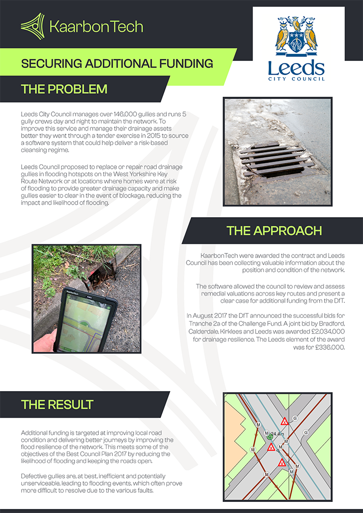 KaarbonTech were awarded the contract and Leeds Council has been collecting valuable information about the position and condition of the network.The software allowed the council to review and assess remedial valuations across key routes and present a clear case for additional funding from the DfT.In August 2017 the DfT announced the successful bids for Tranche 2a of the Challenge Fund. A joint bid by Bradford, Calderdale, Kirklees and Leeds was awarded £2,034,000 for drainage resilience. The Leeds element of the award was for £336,000.