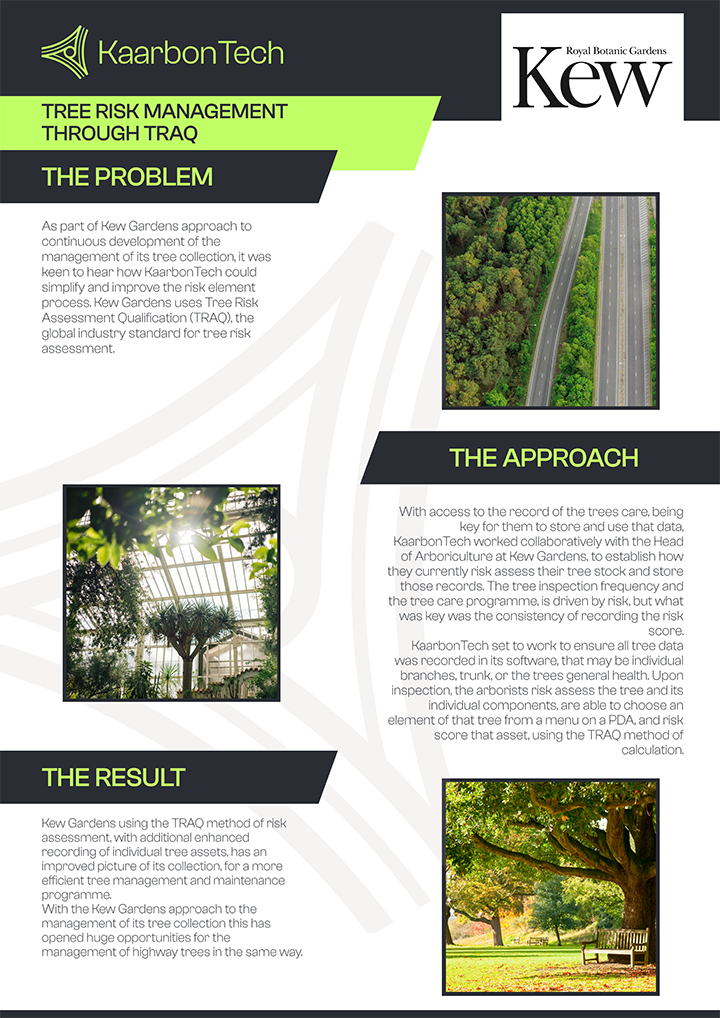 As part of Kew Gardens approach to continuous development of the management of its tree collection, it was keen to hear how KaarbonTech could simplify and improve the risk element process. Kew Gardens uses Tree Risk Assessment Qualification (TRAQ), the global industry standard for tree risk assessment.