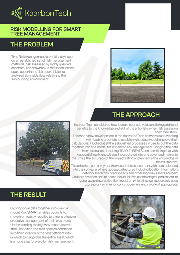 KaarbonTech considered how it could best add value and bring additional benefits to the knowledge and skill of the arborists when risk assessing their tree stock. This was a new development in the KaarboneTech software suite, working with leading arborists to establish what data would improve their calculations. It looked at all the established processes in use, to pull the data together into one model, for enhanced risk management. Bringing the data from all sources including TRAQ, THREATS, and combining that with geospatial intelligence, it was incorporated into one advanced matrix, to maximise the accuracy of the impact rating and enhance the knowledge of the risk factors. The arborists can carry out their usual risk assessment with data uploaded into the software, where geospatial features including location information, network hierarchy, road speeds and other highway assets are held. Councils are then able to score individual tree assets or grouped assets, to generate an interactive risk model on which they can accurately base future programmes or carry out emergency works if appropriate.