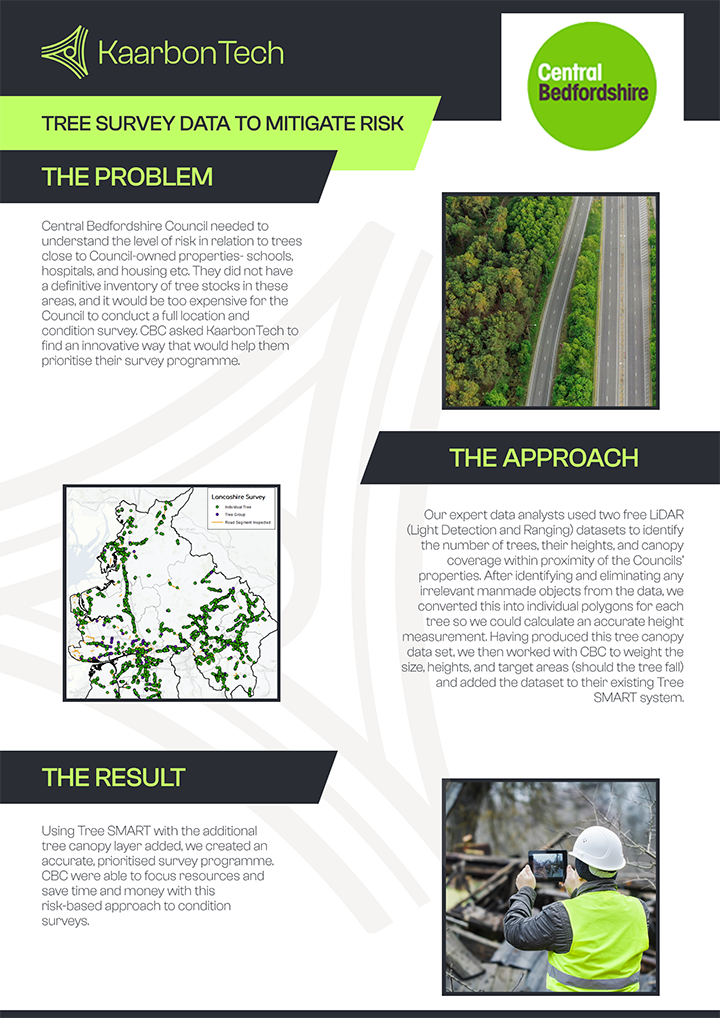 Central Bedfordshire Council needed to understand the level of risk in relation to trees close to Council-owned properties- schools, hospitals, housing etc. They did not have a definitive inventory of tree stocks in these areas, and it would be too expensive for the Council to conduct a full location and condition survey. CBC asked KaarbonTech to find an innovative way that would help them prioritise their survey programme.